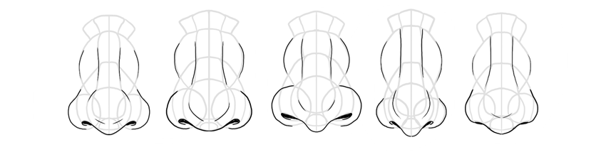 如果您查看轮廓中的鼻子,则可以使用多种方法来排列元素以创建鼻子。它可以指向上方或下方,圆形或尖头,笔直或隆起。没有一种完美的形状,对所有人来说都是“默认”!