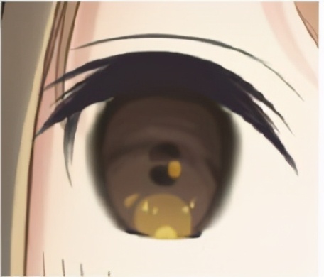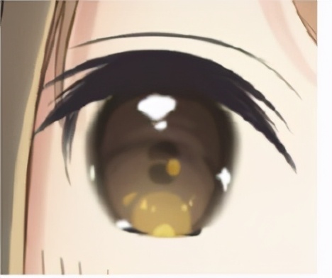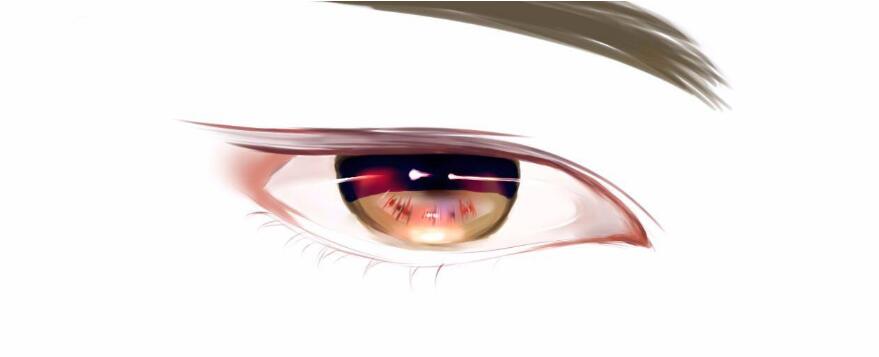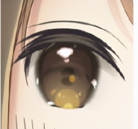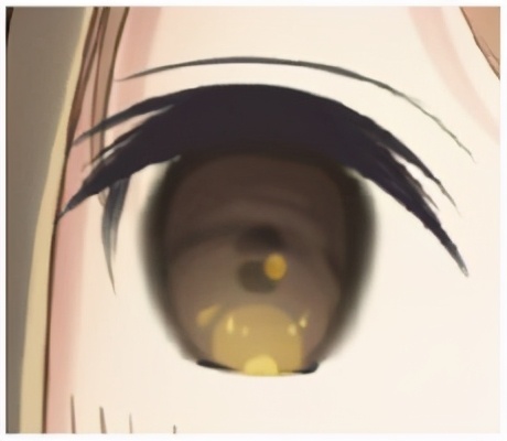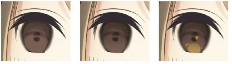 3在下部分画半圆的光,使半圆的上侧变薄。光的颜色比瞳孔的基色明亮,色调错开就可以了(如果基色是红褐色,光应该是黄色等)。并且在半圆的旁边加入水滴型的光,在瞳孔的旁边加入圆形的光。