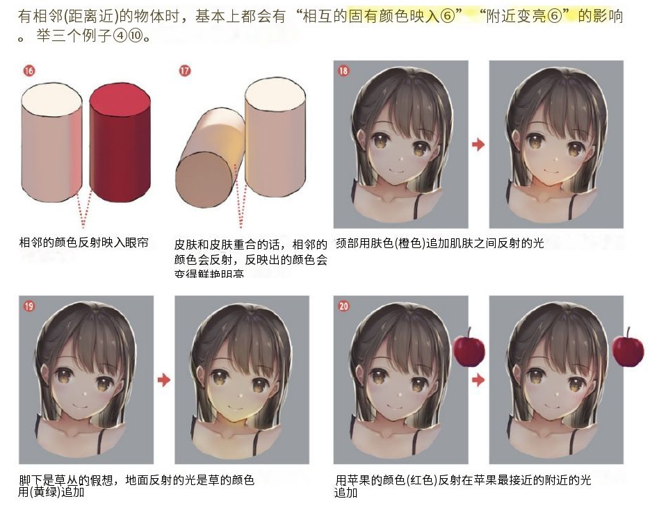 发出的光会影响外观。与直接照射物体的光不同,如果能够意识到“环境光即被其他物体反射而到达的光”,色调和阴影的表现就会更加深刻。例如,皮肤和皮肤重合的地方是透明的