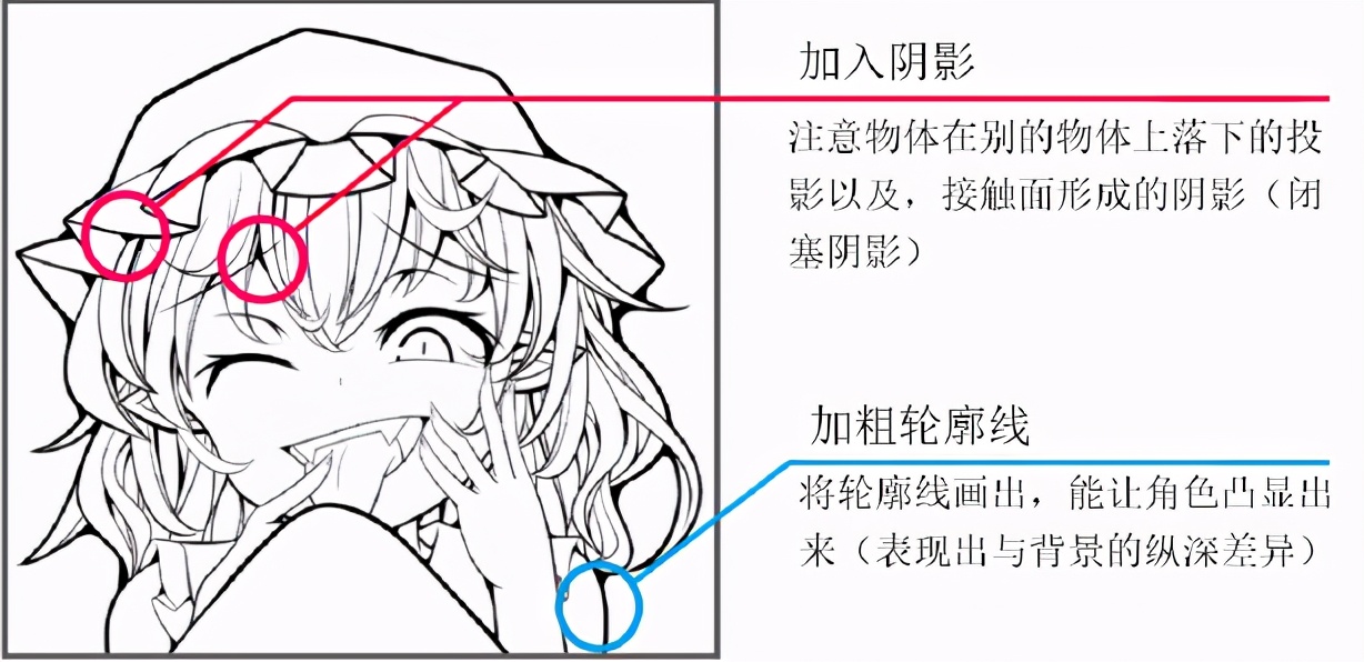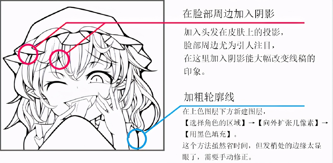 加入头发在皮肤上的投影,脸部周边尤为引人注目,在这里加入阴影能大幅改变线稿的印象。