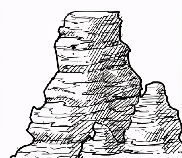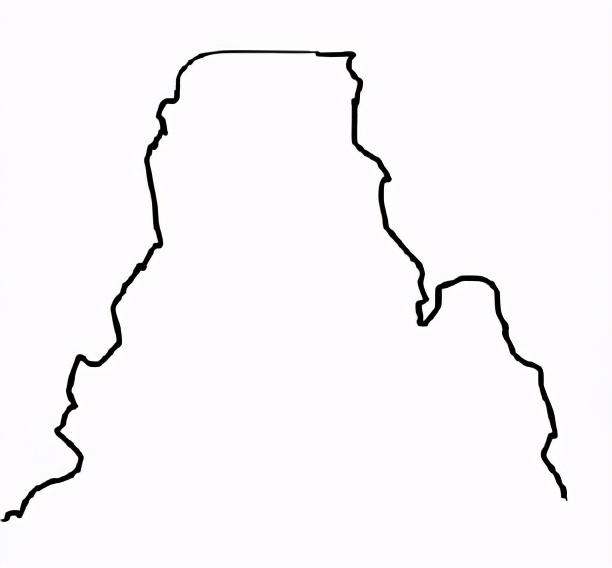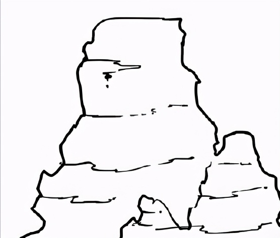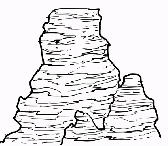 用比较粗的笔刷画出岩石的轮廓。峡谷的岩石有很多水平方向的冲击纹路,所以构造要画成有很多平面、不规则的东西在顶部。