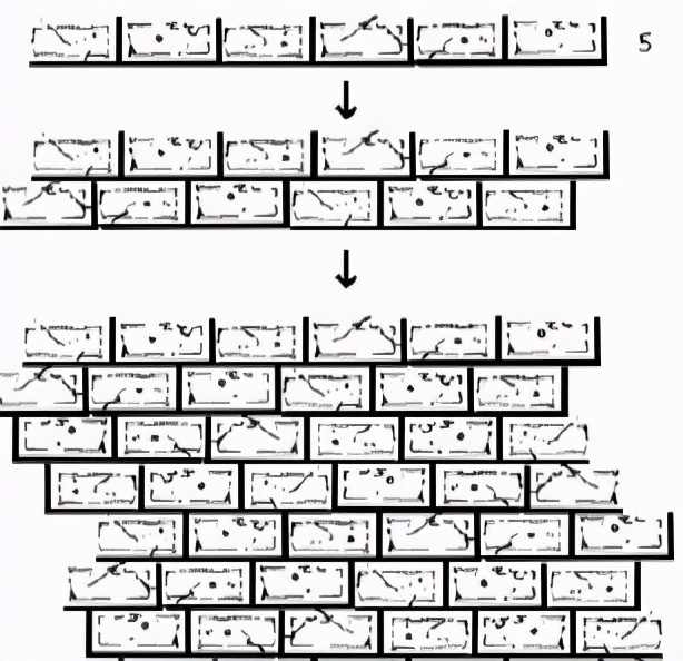 画6种不同的凹凸的图案然后复制并按照水平边对边组合起来就得到墙壁啦。