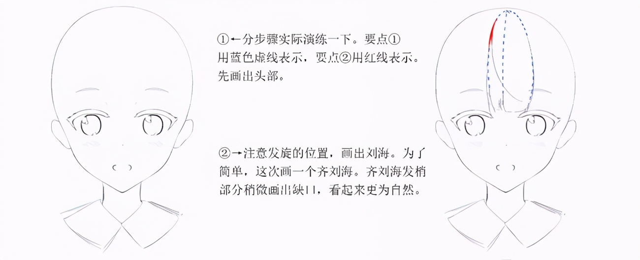 用蓝色点线表示,注意发旋的位置,画出刘海。为了简单,这次画一个齐刘海。齐刘海发梢部分稍微画山缺口,看起来史为白然。