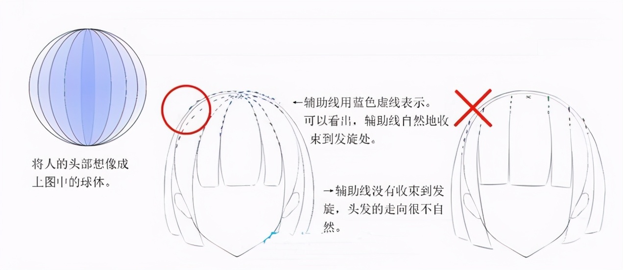 很多新手画不好头发,没有头发走向的意识。那么,不妨将自己所画的头发线条延长,看看辅助线是否顺着头发的走向。头的顶点有发旋,头发的走向以发旋为起点,而的时候试若将头发分成大致的几缕。此时将头发想象成一块披在球体上的软布或许更容易理解。延长发线做辅助线,确保辅助线自然地收束在发旋处。有这个意识后,不单线稿会变得更加自然,上色也会变得更为容易。