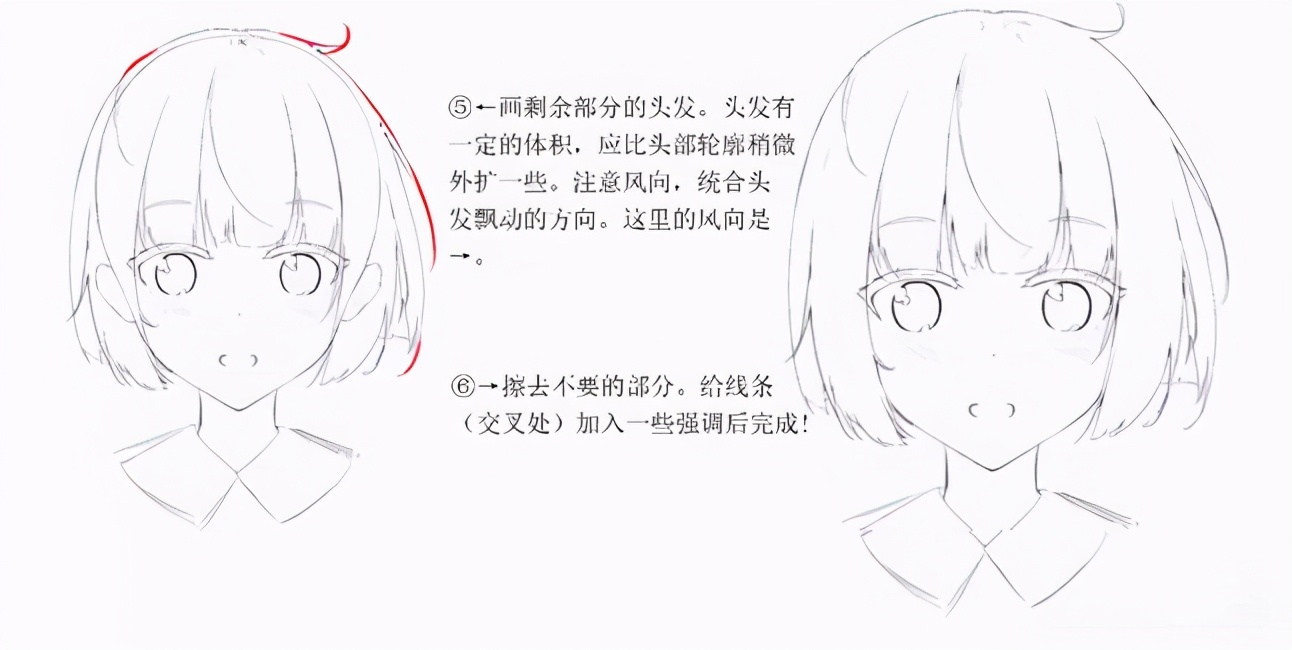 头发有一定的体积,应比头部轮烧稍微外扩一些。注意风向,统合头发飘动的方向。擦去不要的部分。在线条交叉处加入一些强调后完成!