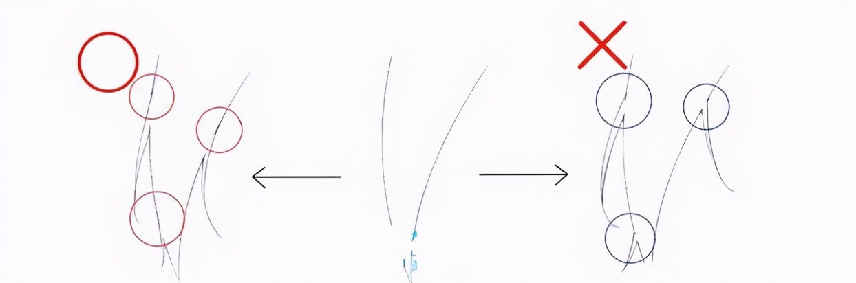 如上图,画好大致的发束后,开始添加细小的发束。注意发束大小和位置间隔不要太接近。发梢处可以再分出一束。此时要注意的是,添加的头发和主发束应用流畅的曲线相连。左边的例子,分又连接流畅。头发走向白然。而行边的例了,分义非常突儿。头发是很柔软的,基木上看不到突然的弯曲,因此台例看上去不自然。怎么画漫画人物女生头发?在了解清楚上述所说后,我们来大概看一下两个案例的步骤示范~