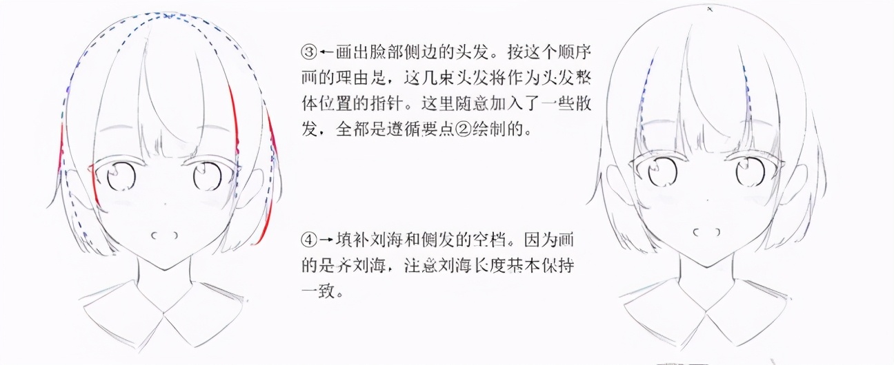 按这个顺序画的理由是,这几束头发将作为头发整体位置的指针。这里随意加入了一些散发。填补刘海和侧发的空档。因为而的是齐刘海,注意刘海长度基木保持一致。