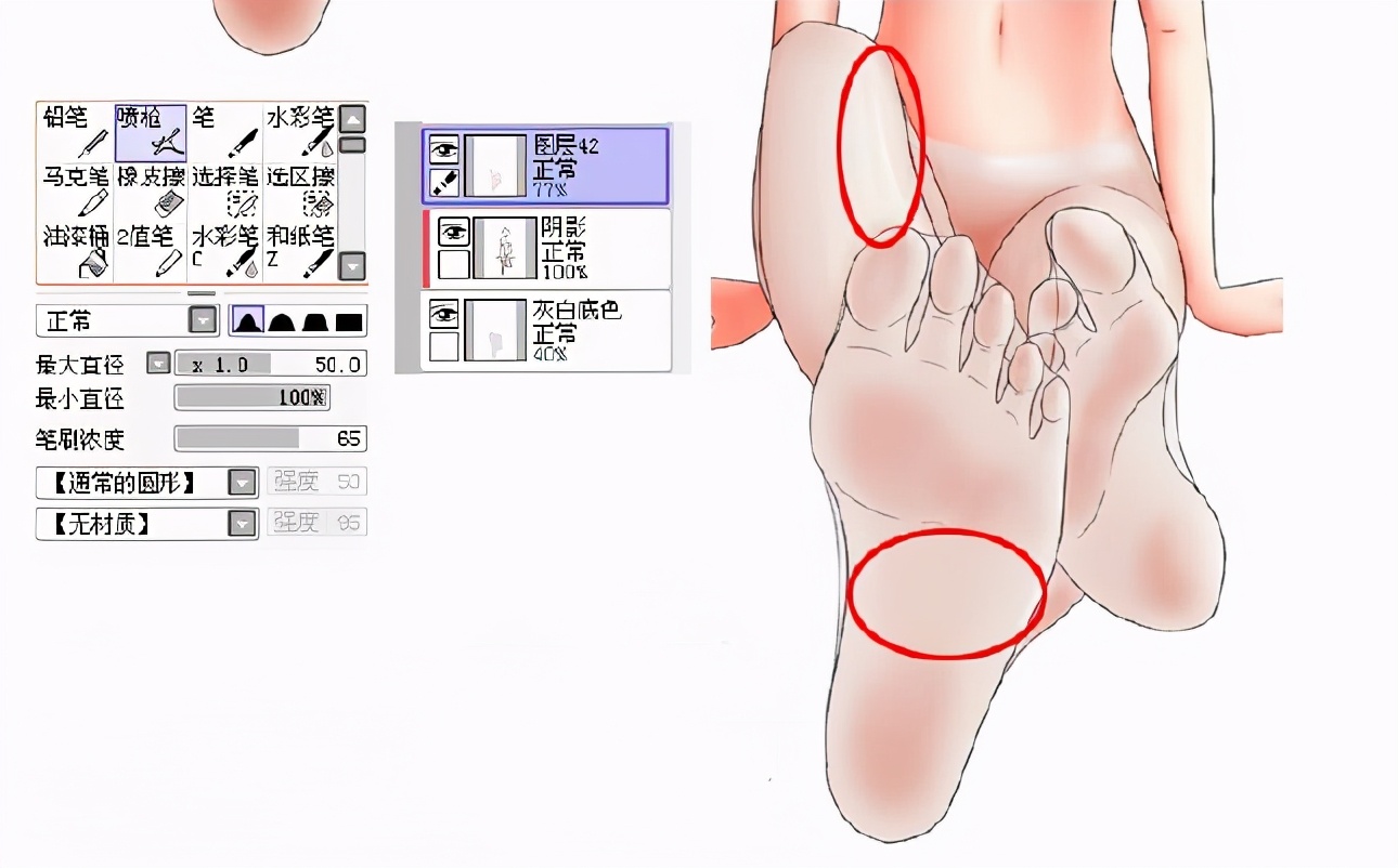 如果没有画腿脚的肤色,直接涂丝袜只需要在灰白底色下层加一层大概的肤色,然后给丝袜画出明暗关系的时候手动画出,其它部分都是一样的操作。