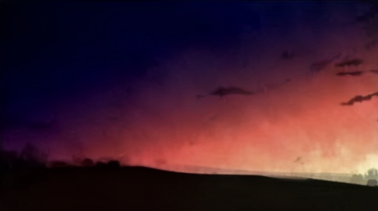 在天空的下半部分粗略画上朱红色,以便精细上色。