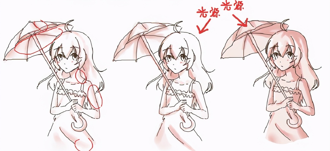 那么阴影和高光都不是分别在另一边的。高光及受光面会分布在光源能够照到的一面,其它部分全都是阴影,太深奥?图解一下。