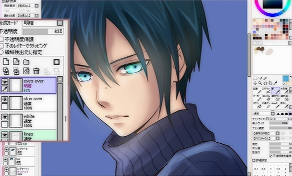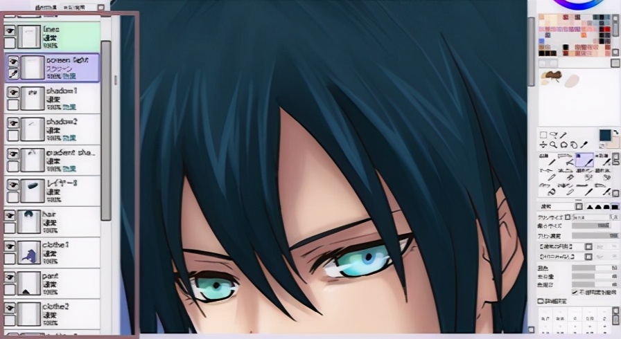 至于眼睛,在阴影层上面会再建一个层,层上面刷点颜色,接着混合模式是正片叠底(没有原因地喜欢这么千)。然后在线稿层眼睛上面会加一道白光。