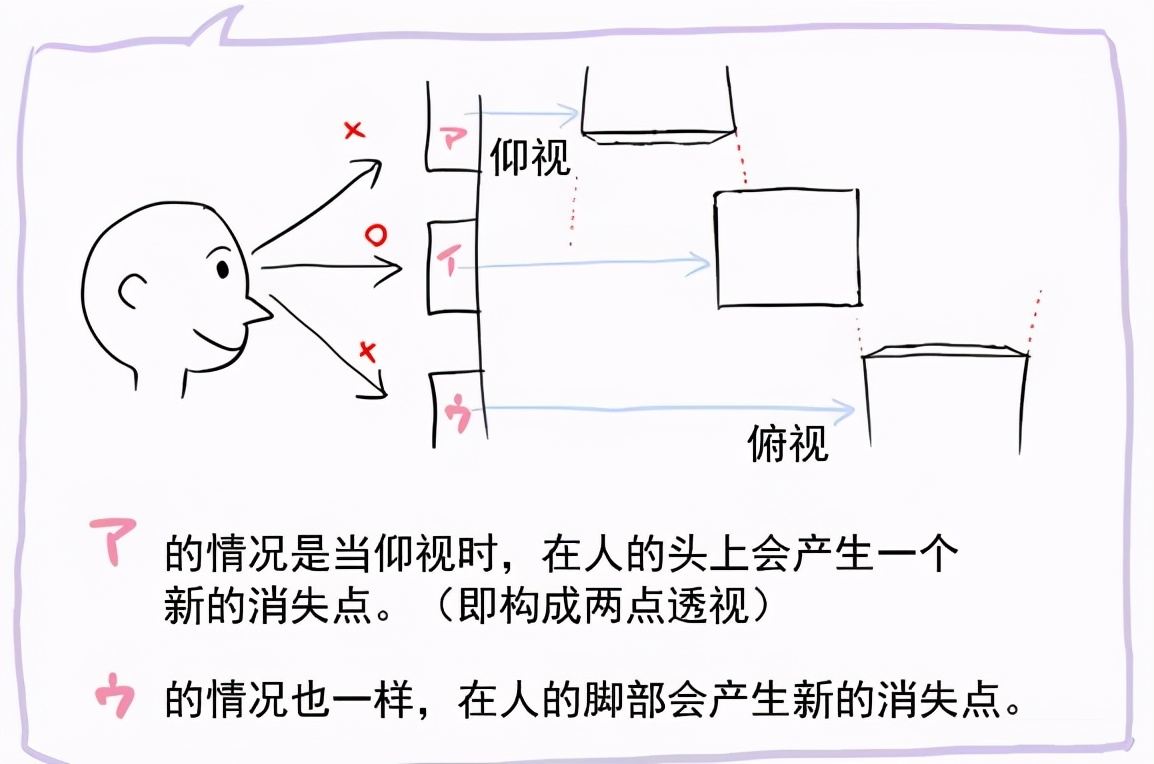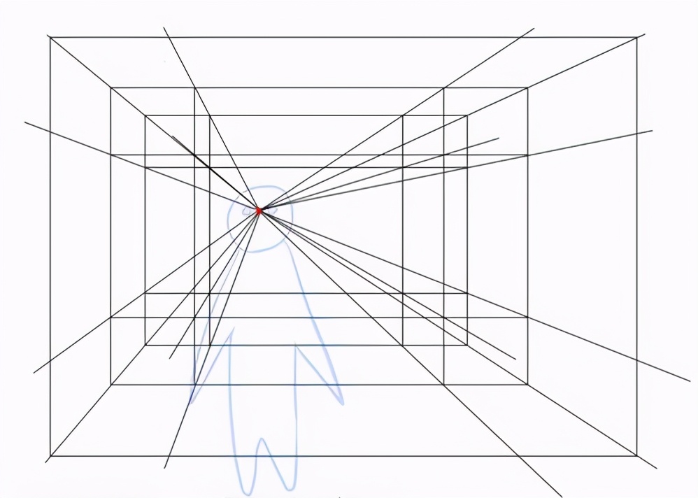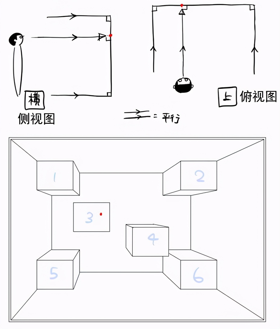 图中除3以外的箱子,只有在我们的眼睛紧盯着图中红色消失点时才可以画成那样子。