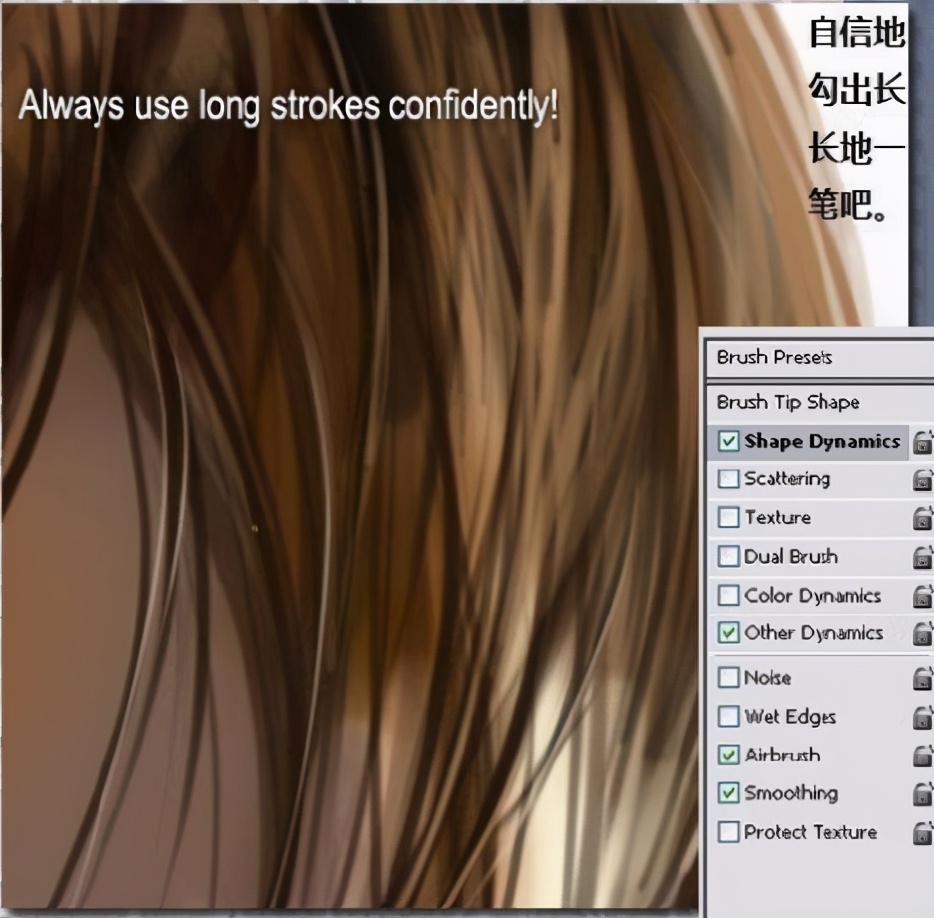 处理头发,可以用前面讲到的第一种笔刷,我这回用的是0%直径(你可以在形状动态里找到)