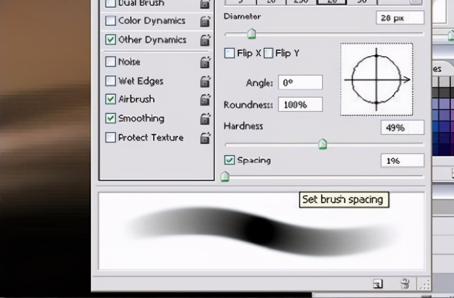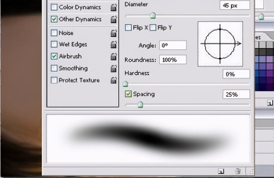 为了喷出来效果比较柔和,我推荐把硬度设置成0%然后间距为25%。这个设置是用来做皮肤那类需要很柔和的效果的时候用。