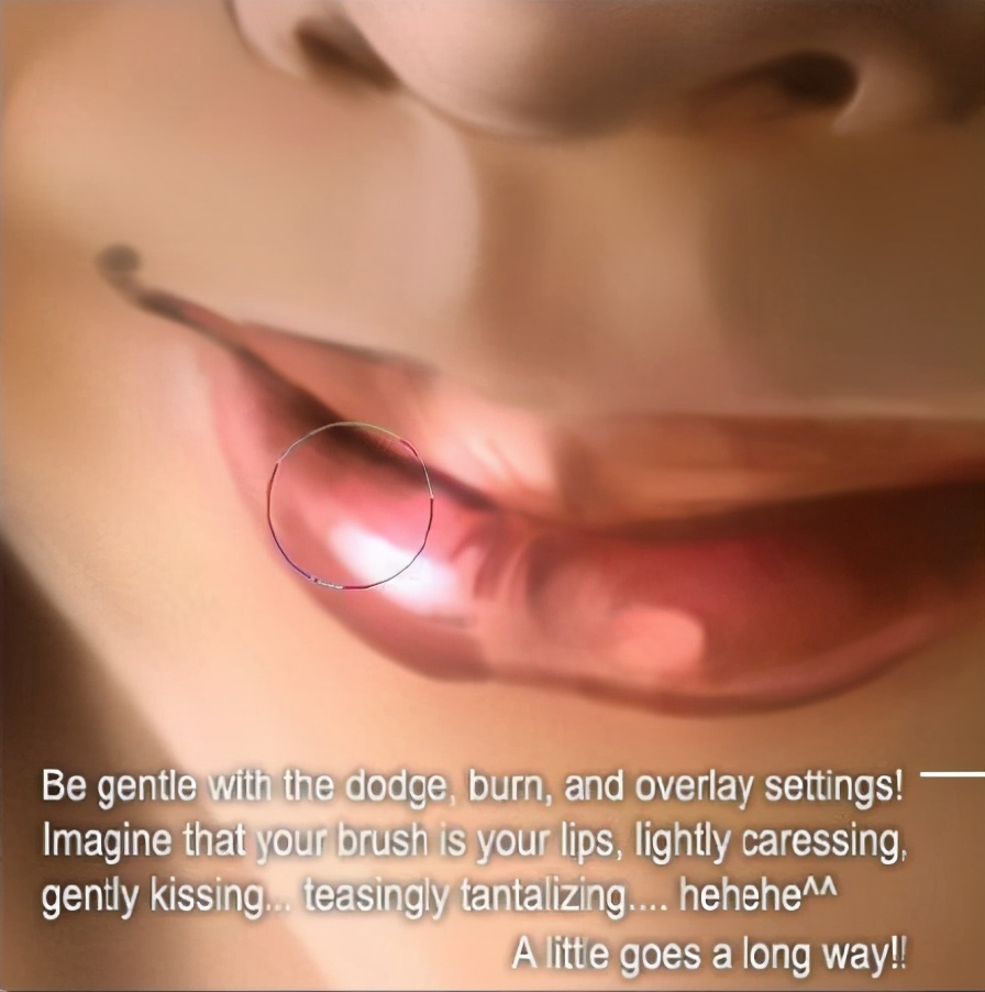 然后笔刷调到"色彩减淡”然后选择白色。轻轻地涂她的嘴唇。同样的办法来处理脸上的高光