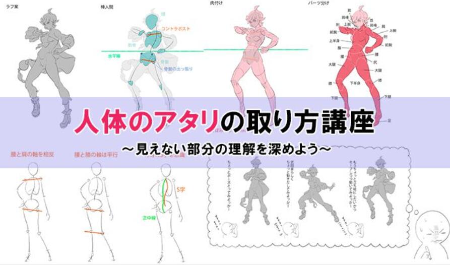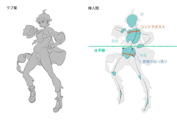 基于以上内容,在注意头部,肋骨,骨盆骨和牙结石的同时充实棒形人物。另外,要注意地平线并进行绘制,同时注意每个部分的哪一侧可以看到还是看不到。