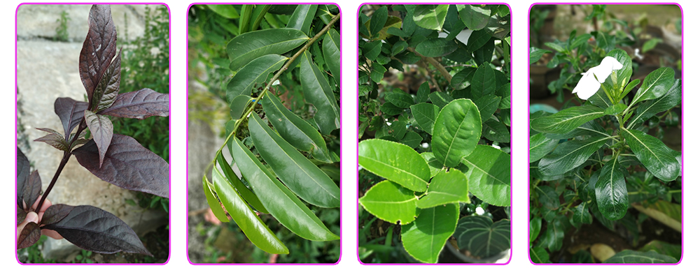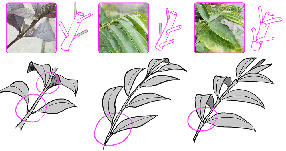 根据植物的不同,叶子从树枝上延伸出来的图案也不同。下图展示了在我妈妈的花园里找到的三种植物的图案。如果您想为所绘制的叶子添加更多细节和特征,请用它作为指南。我通常搜索植物的名称,并在画布上绘制之前研究形状和图案。
