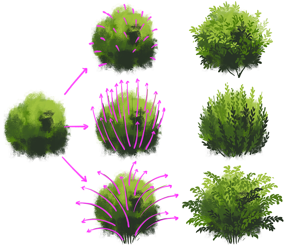 下面我将介绍一些从最初简单到不同方向绘制灌木丛的顺序。