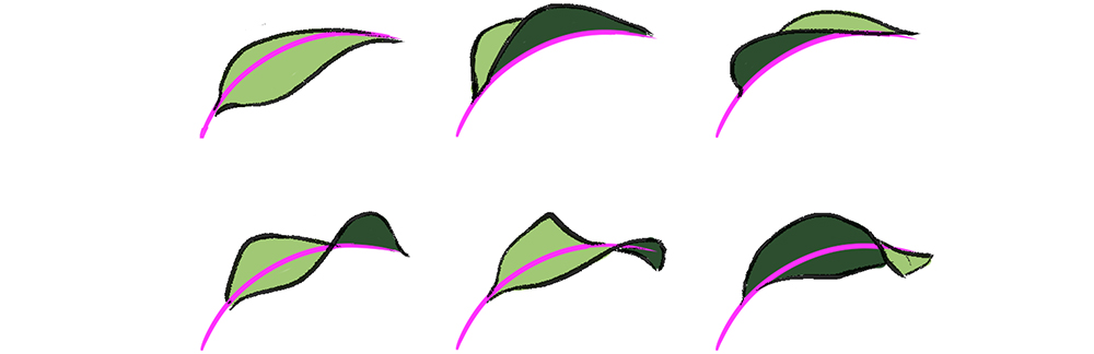 每片叶子形状不同,但有中心线,就像普通人的脊骨一样。该线可用作绘制叶子的动作线。以下是从同一中心线绘制树叶的角度或姿势。