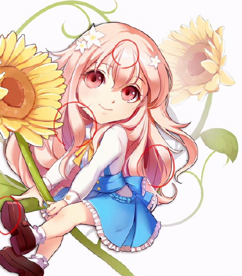 阴影先用硬朗的笔刷画出来,并结合涂抹工具在柔软的转折部分涂抹。例如图中红色圈圈那里