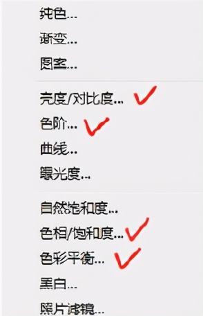 常用的是打钩的这些,这个用来做最后的画面调整。选偏红的颜色色用了叠加图层,在红圈的地方