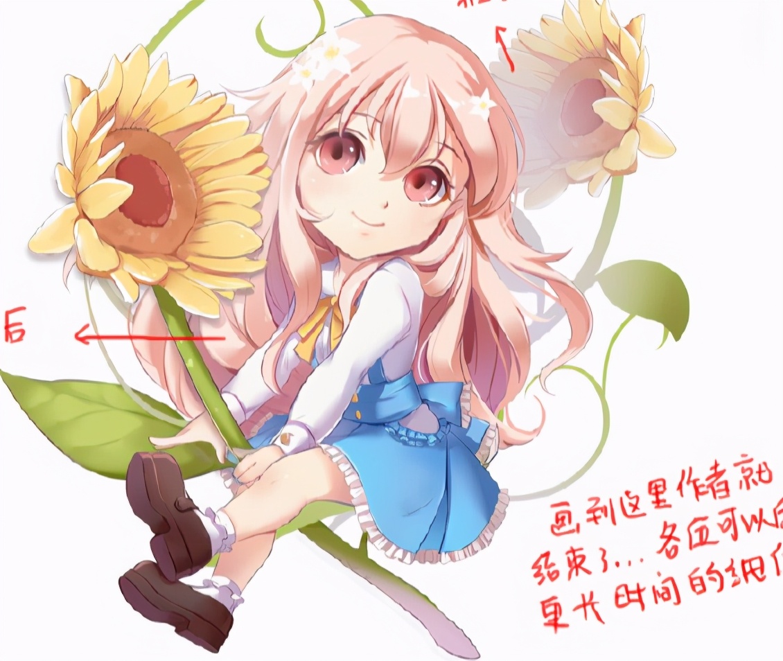 为什么说是关系的细化,因为这一步根本没在细化,只是把前后关系、物体与物体之间的关系画得更加明确。像头发那里,深色衬着浅色,浅色衬着深色,东西才能出来。后面的向日葵加了一些紫色,推后去。想让物体推后面去,都可以用这个方法。