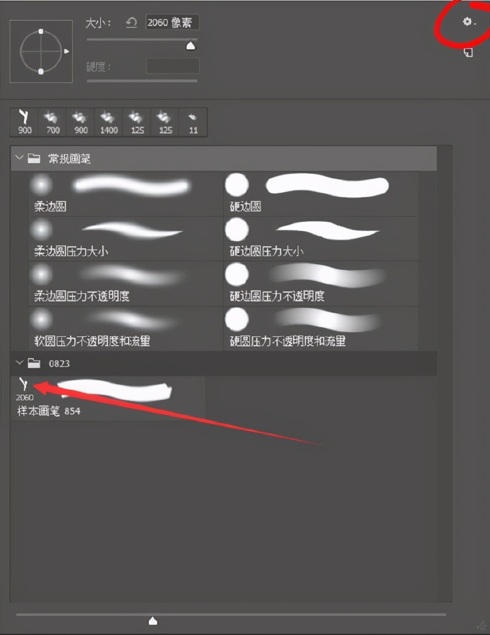 然后我们就看到笔刷栏里出现了刚刚保存的形状笔刷如下图左下方红色箭头指向处,如果想保存做好的笔刷,点击右上方的小齿轮导出选中画笔即可。