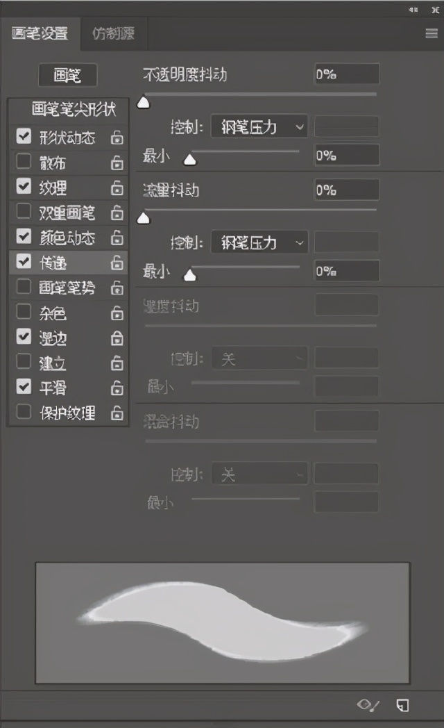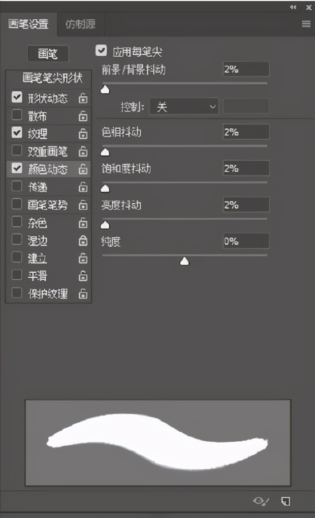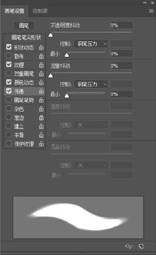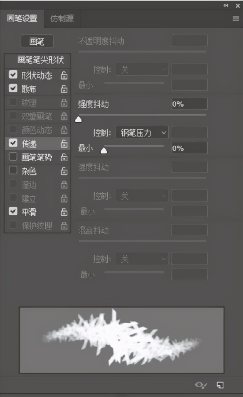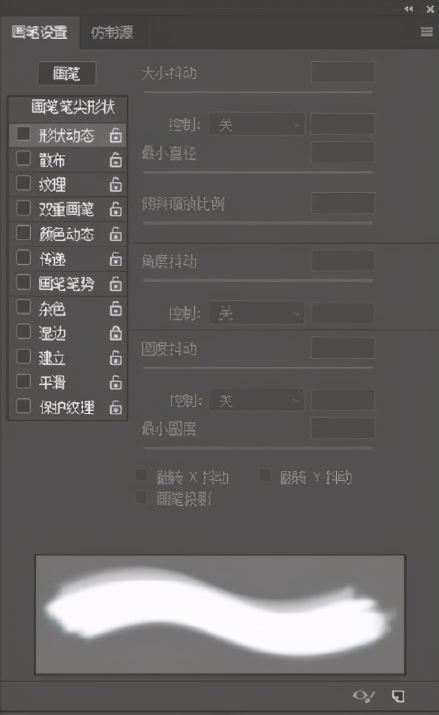 笔刷的基本形状制作好保存好之后。我们就可以开始在画笔预设里调整笔刷的性能(如下图)