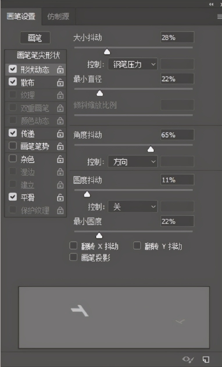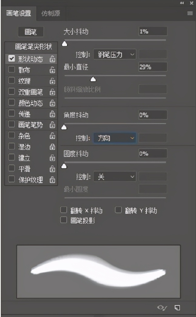 选择形状动态打√,于是就出现了下图的内容,注意画面中出现的参数设置,设置好