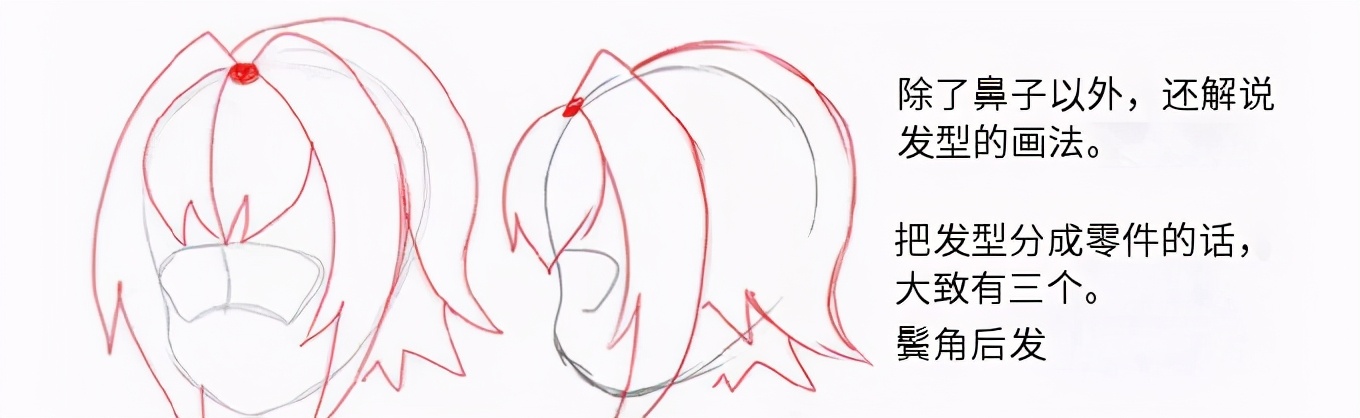 除了鼻子以外,还解说发型的画法。把发型分成零件的话,大致有三个。鬓角后发