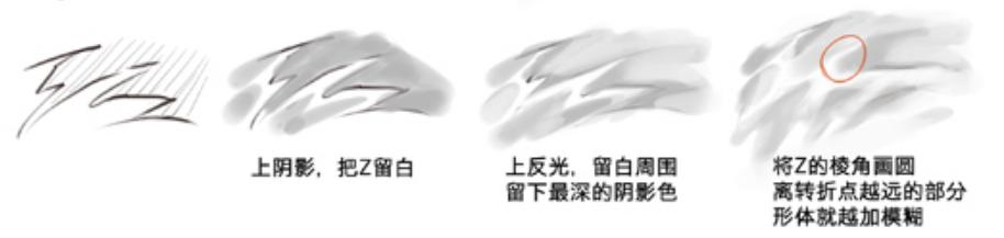 再来随便画几笔,记得中间留出这个Z的折线,记住不是要下笔画这条线,而是通过画阴影的部分把它留白出来。你用手指去挤按这个布料,按住的地方是阴影,挤出来的地方是高光,下笔逻辑同理。