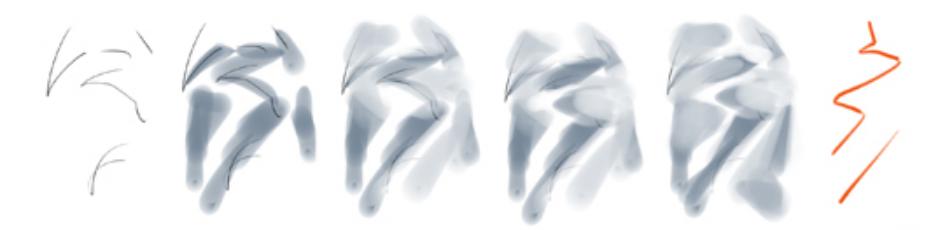 Sai里面铅笔的默认笔刷画水滴形状的笔触非常方便,用来画衣褶的大结构又快又准
