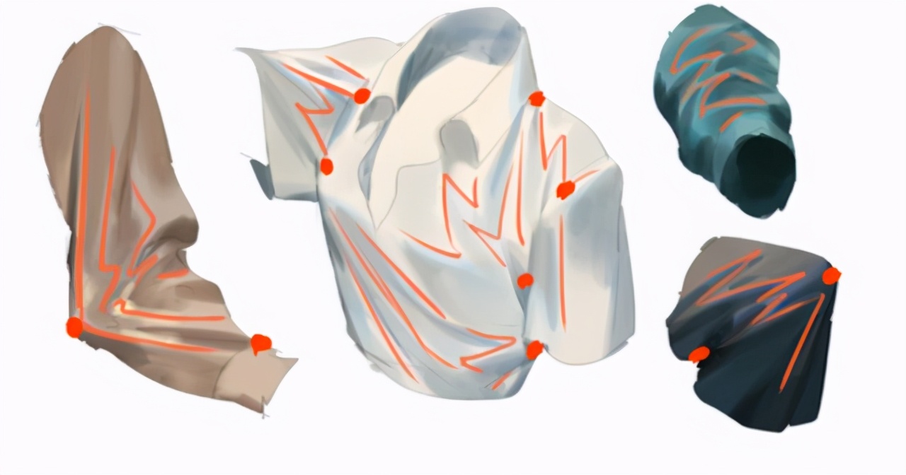 最后标一下拉扯点注意观察Z子线的走向和稀疏关系,没有什么褶皱会保持均匀散布的褶皱节奏,有密有疏才会显得自然。
