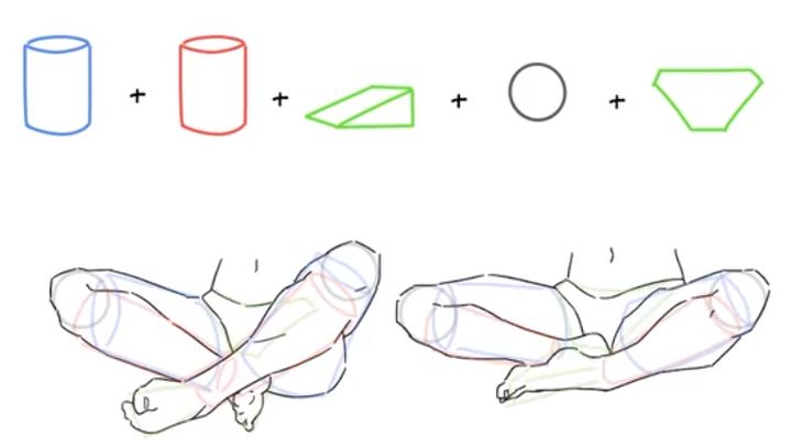 下半身的组成,大腿与小腿我们可以用圆柱体来给它们进行概括