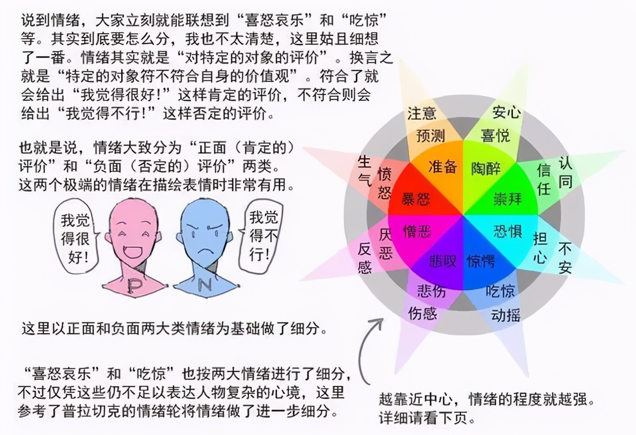 “喜怒哀乐”和“吃惊”也按两大情绪进行了细分,不过仅凭这些仍不足以表达人物复杂的心境,这里参考了普拉切克的情绪轮将情绪做了进一步细分。越靠近中心,情绪的程度就越强。