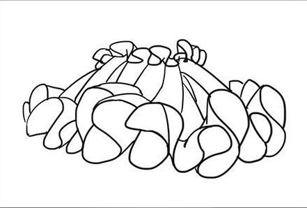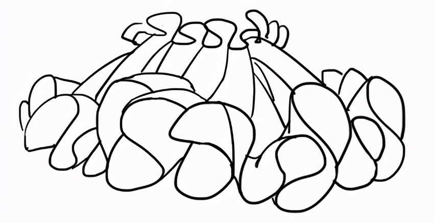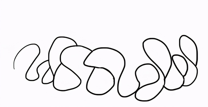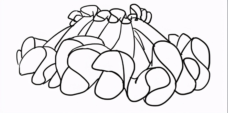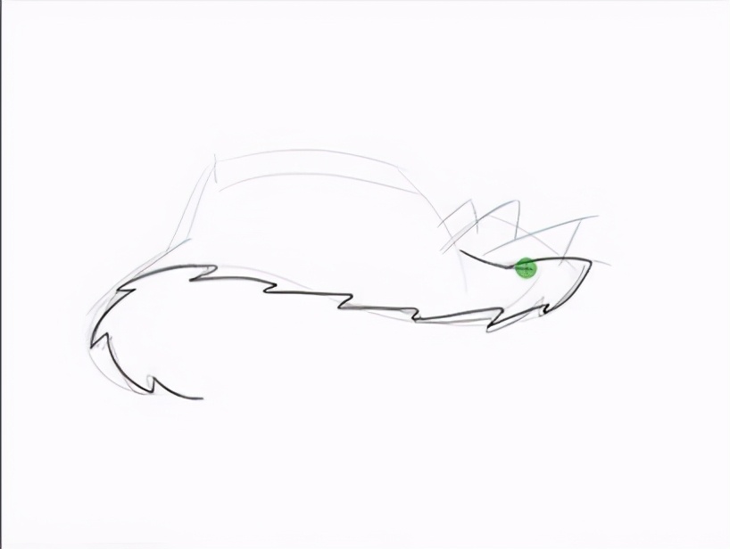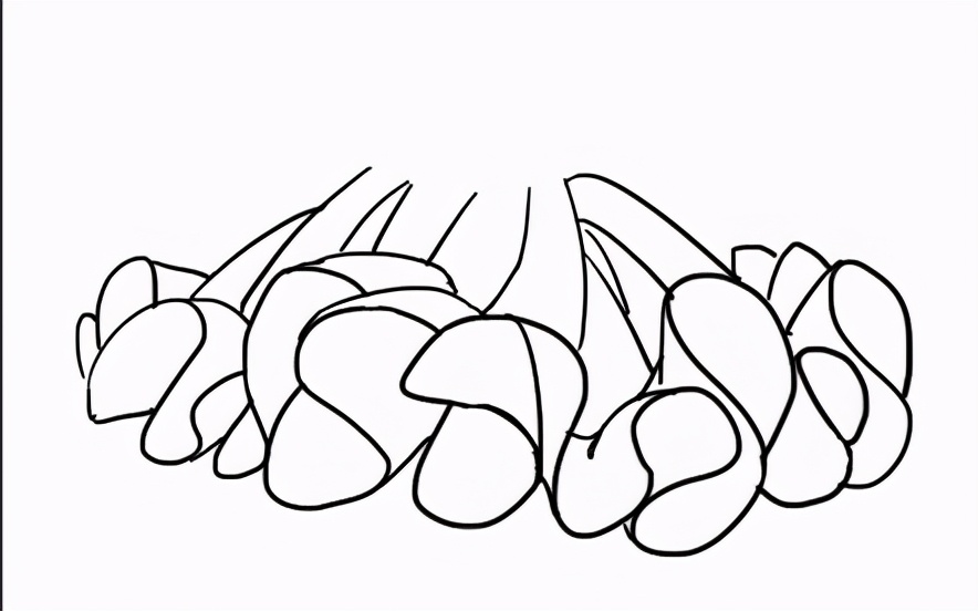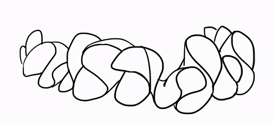 整个轮廓微微中心向下画出抖动的弯典弧线,曲线可以有相交,要注意弧线的大小节奏。