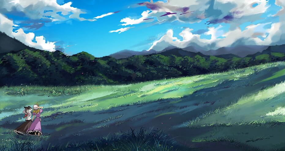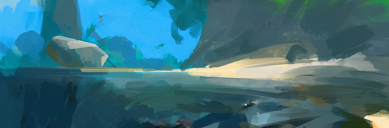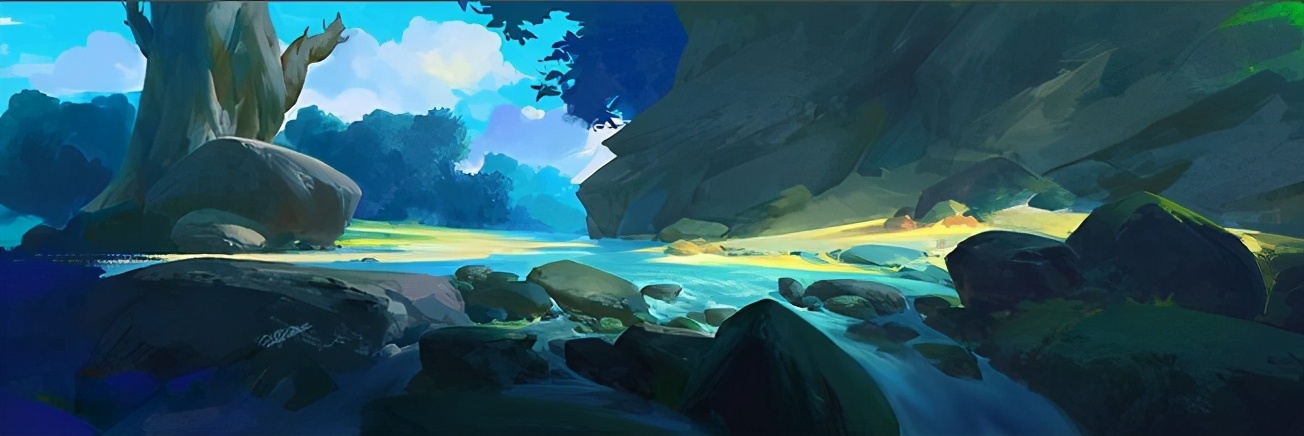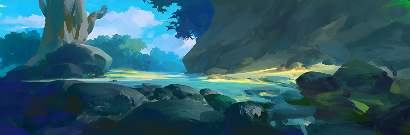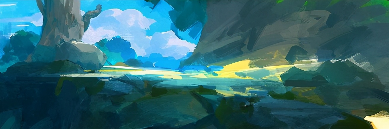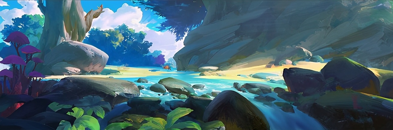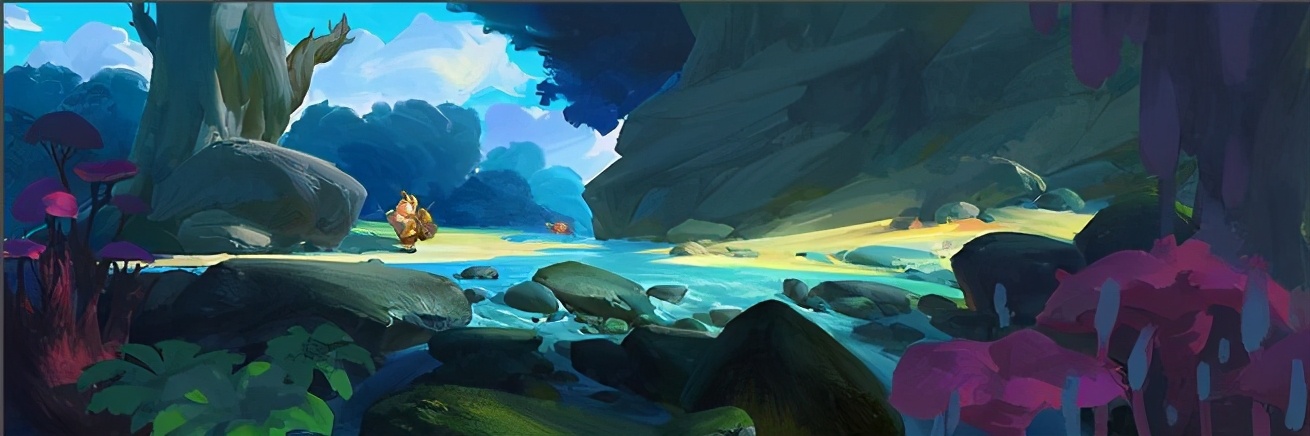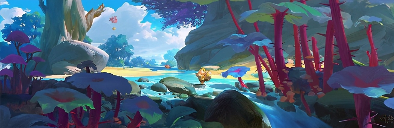 进步调整画面的同时, 对每-个景深的物体的空感处理到合适的效果,目前这张画面来说的活,中景的主要物体因为受光比较强,所以对比度会相对比较高,缩小了远处树丛的面积,让天空的面积变大,从而设置更多的景深关系,比如说远处的树后面还有更远的树,还有云加上更远的天空。让画面更加送.中近景的植物也重新做了设计,用了饱和度比较高的颜色体现他的存在感,毫无疑问它的面积以及它的颜色让它成为这张画面的主体。
