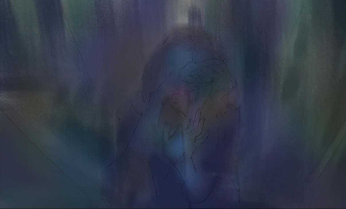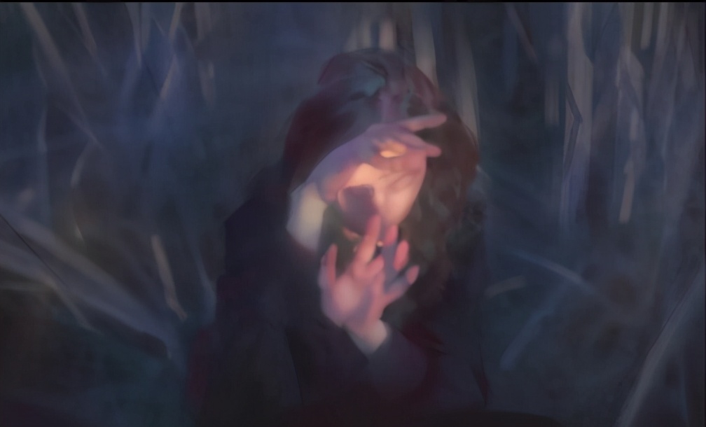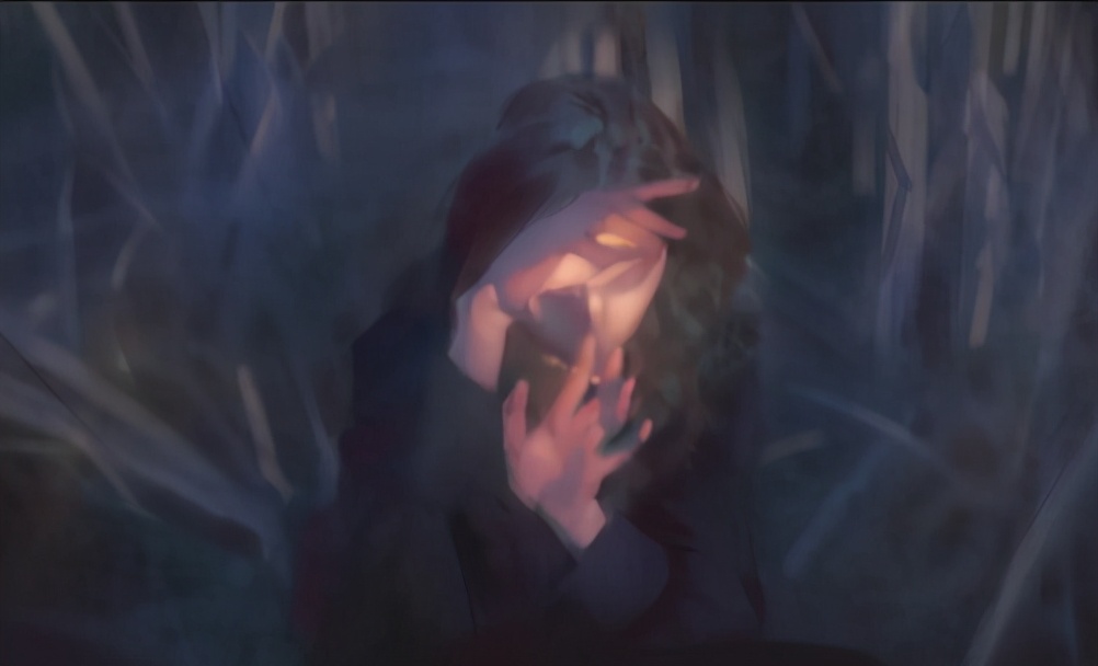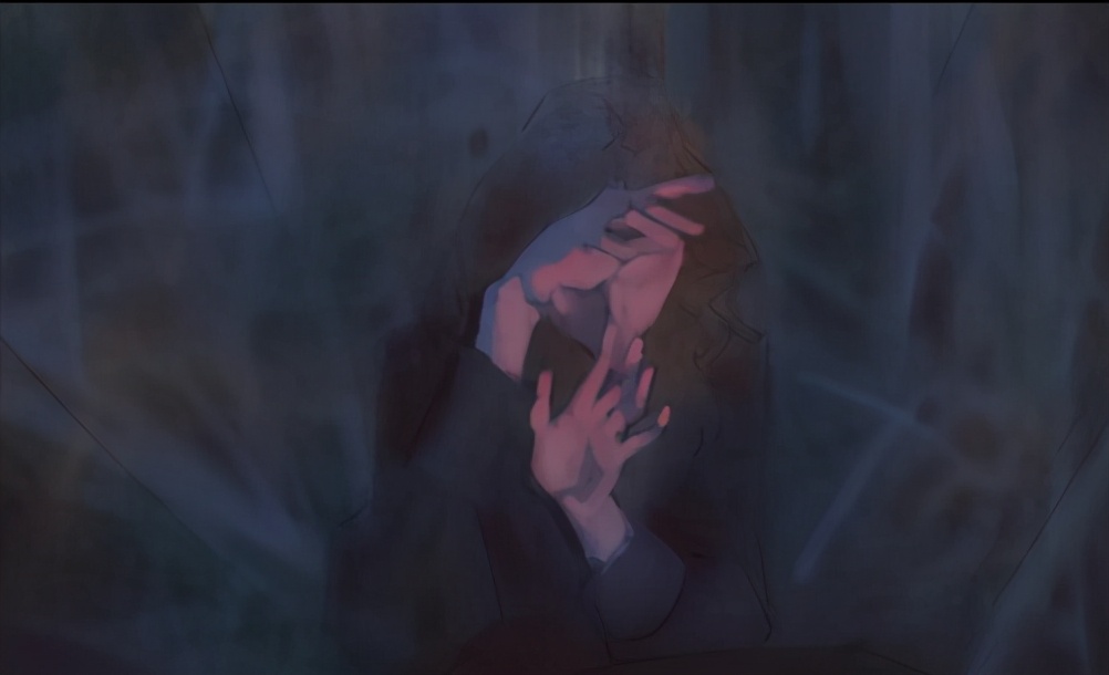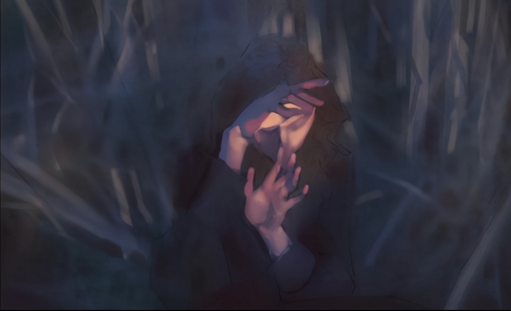 用黑色的渐变色团来区分出画面的前后关系。靠前的颜色浅越靠后越深。这种色团的形状都是一边虚(柔和的渐变过渡),一边实(没有渐变)。找到物体和物体相交的位置, 顺着边缘向外推渐变过渡,很容易出效果。如例图中女人的手在前,头部在后,找到头和手交接的那个边,顺着这个边把渐变晕开,就可以卡出来空间关系