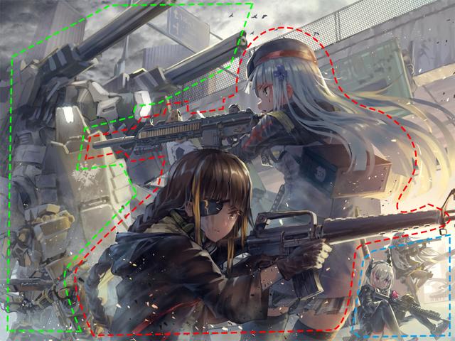 毫无疑问,画面中最重要的部分,是最前面的M16和HK416两个人物(红框部位),因此要着重刻画出来(尤其是最前方的M16),而后方的机甲则是交待战斗的激烈效果,因此以概括为主(绿框部位),而背景场景和远处的几个人物点到为止即可,绝对不会深入刻画(蓝框部位)。