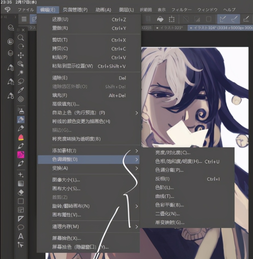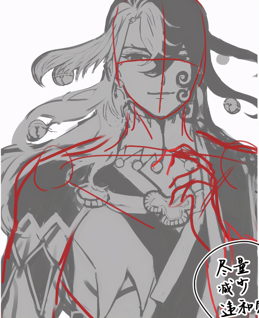 用红色画出大致结构,个人翻转画布进行修正,只画了上半身的,就把画布缩小,补全身体其他部分来确认(用套索工具来移动缩放画面)