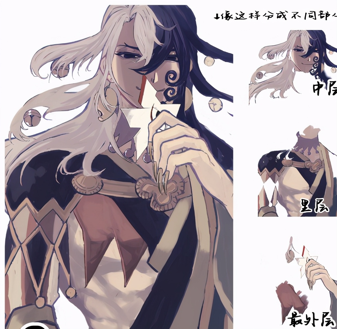 为了方便这些重叠在一起的部分,要每一块都单独分图层。最好是能把画面中后层分开