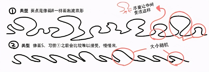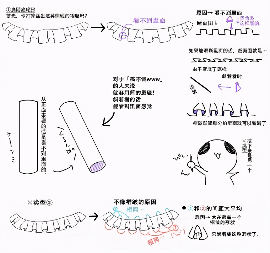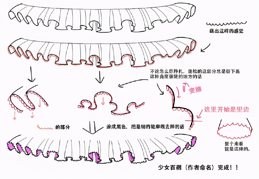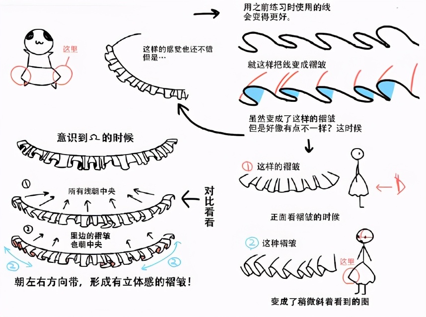 首先请先忘记褶皱的形状和表里,原因在于过于在意褶皱,反而使线条变得生硬,为了能够画出柔软的褶皱,现在开始↓的线来面,用乱七八糟的线来画吧!