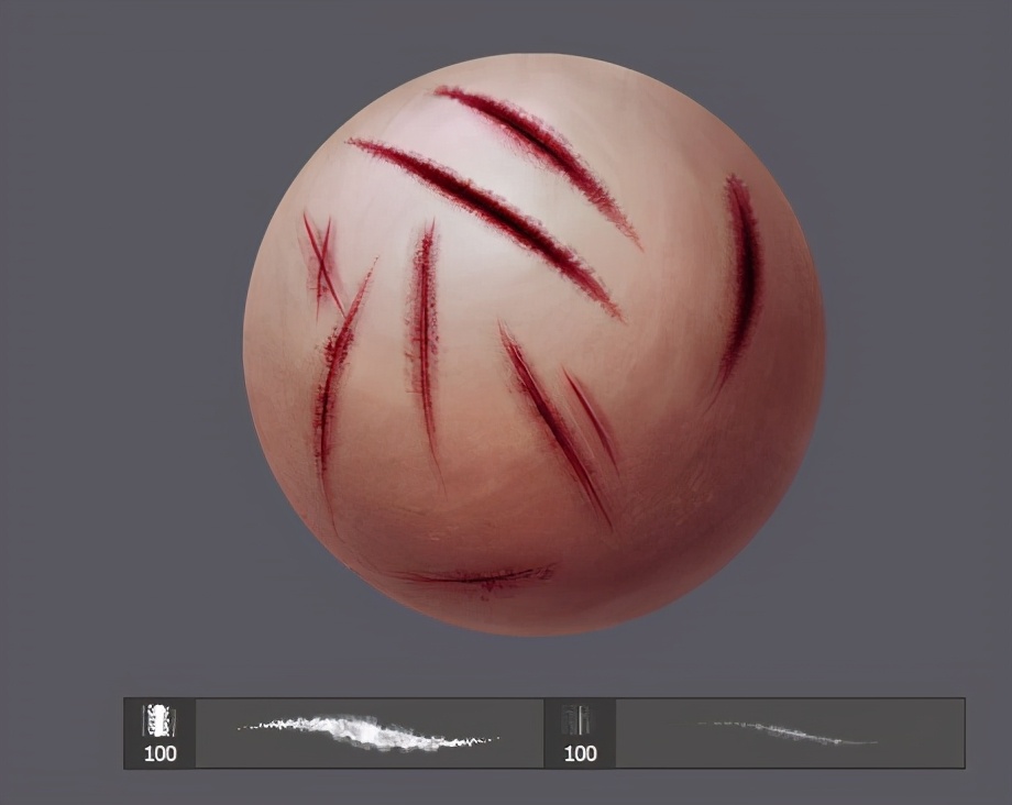 用淡红色,正片叠底来绘制刀伤。每画笔都会加深中心的颜色。上图 ,我使用了2种笔刷,不过其实普通笔刷也一样可以有这个效果。最初几笔要用粗犷一点的笔刷,然后再提升硬度来绘制中心。