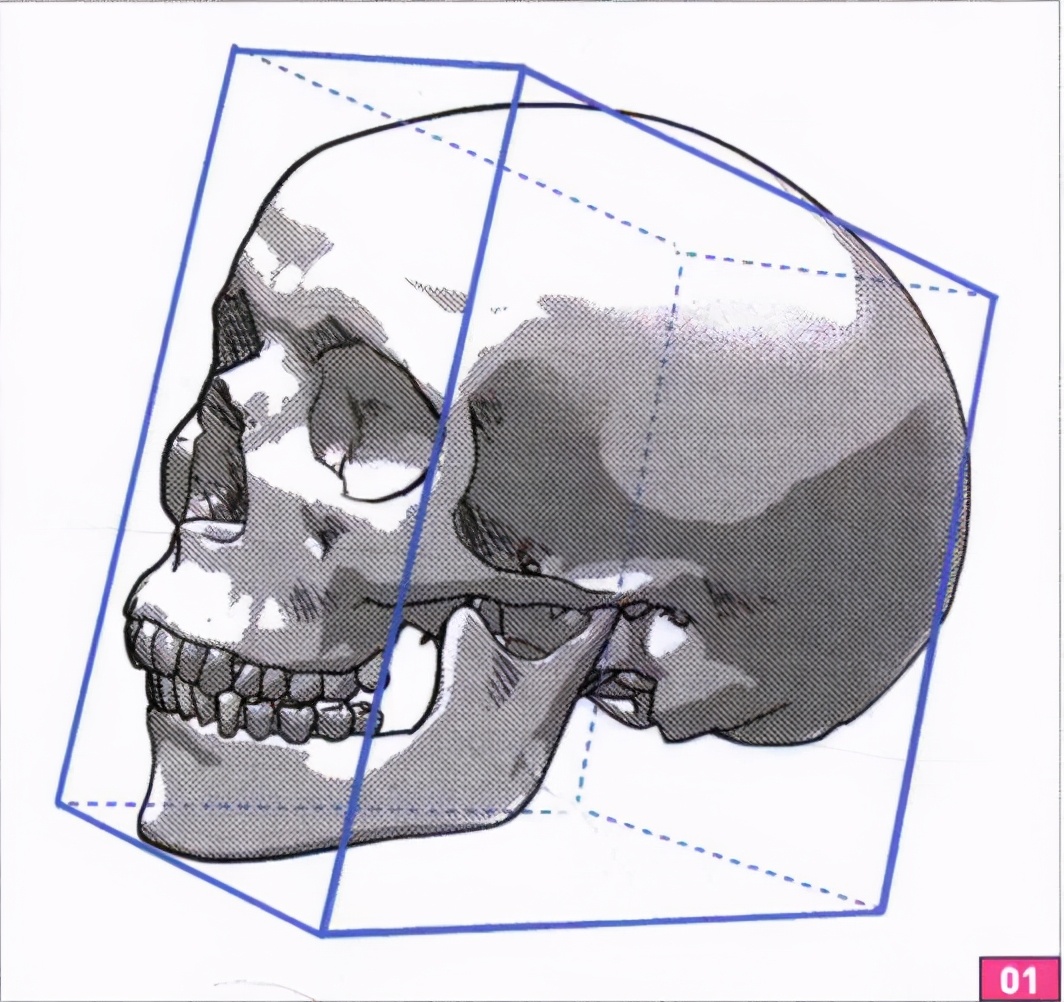 好比下边的骷髅头,就把它当成一个正方体,这样我们对头部的透视掌握就会相对简单很多了。