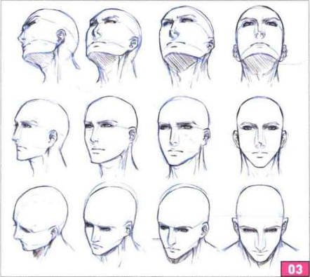 漫画里面要表现出人物是抬头还是低头,脸部最主要的变化就是下巴和鼻子的线条。注意透视方向的变化,线条的表现方式也要有所不同。