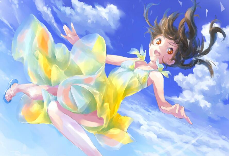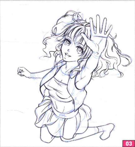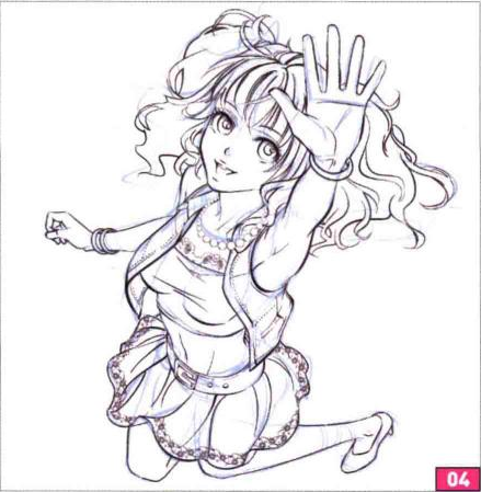 首先打草稿。确定角色的动作和大致的构图。这里要表现的是女生高兴地跳起的画面,镜头是从上往下,因此透视应该注意头大身小。
