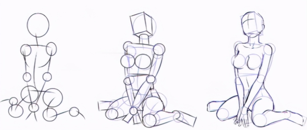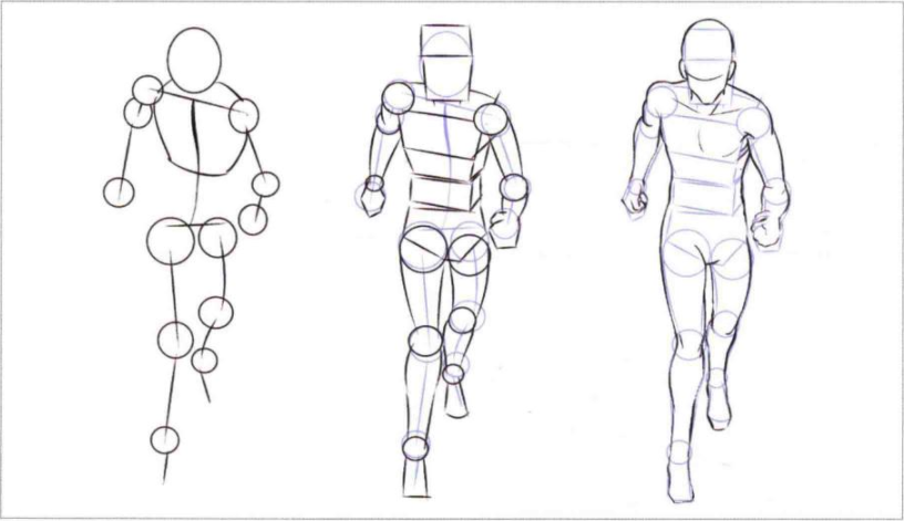 我们可以把人体的四肢躯干和关节分别用线条和圆圈大致做个简单的造型,然后把线和圆圈做几何化,最后再把它们修得肉感一点就行了。
