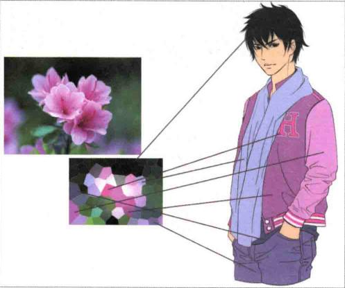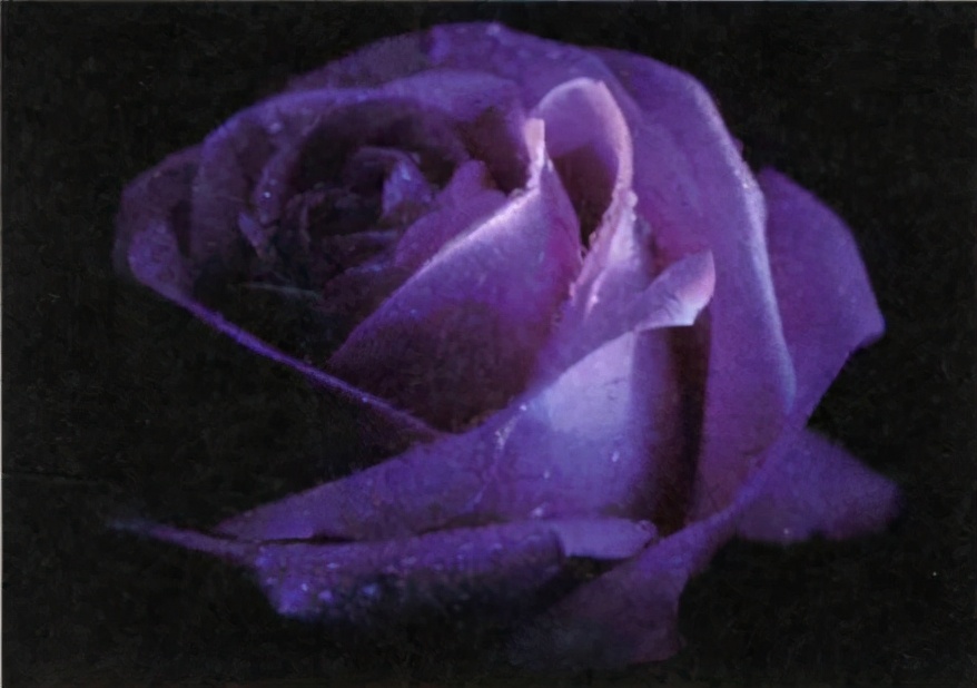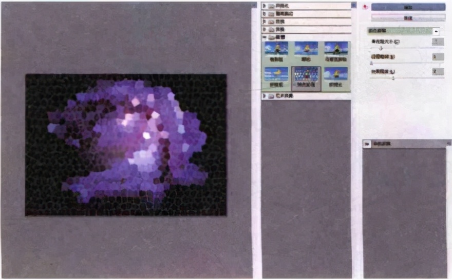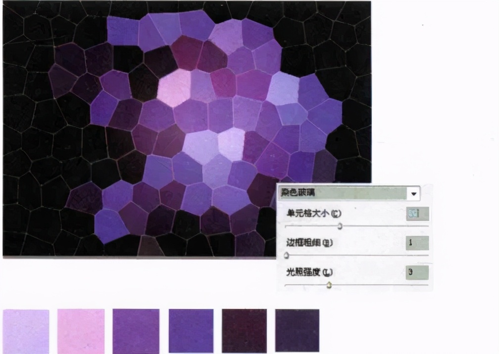 如这朵紫色的玫瑰,我们从网络上下载下来,用Photoshop打开它,然后执行“滤镜/纹理/染色玻璃”命令,就可以看到图片的颜色被细分成很多小方格。