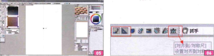 这样页面里就多出了一个对称尺的辅助线。看右上图中工具栏里标示出来的三个图标,都勾选才能让笔画附着到尺子工具上。