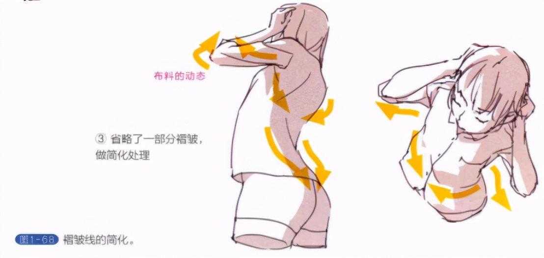 褶皱的画法,会根据人物的动作及衣服的形状等变化而变化。描绘衣服与褶皱时,需要先思考身体的形态。虽然大家画风各有所异,但褶皱画得过多会使画面繁杂,所以我还是建议描绘时整理、简化线条,使用少量的线作画图1-68。